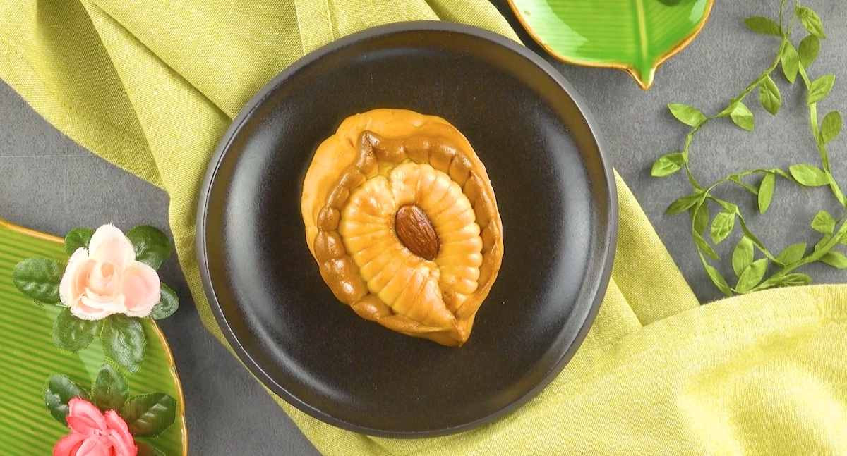 4.4 Klappe die Ränder nach oben, forme zwei Spitzen und lege eine Mandel in die Mitte.