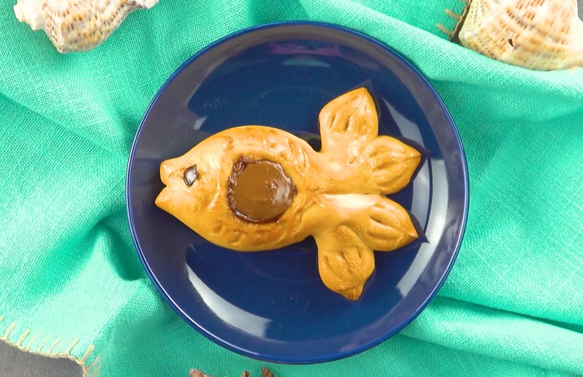 1.2 Bringe den Teig auf der gegenüberliegenden Seite nun in die Form eines Fischkopfes. Drücke mit einem Löffel ein Schuppenmuster in den Brioche-Teig und platziere einen Schokodrops als Auge.
