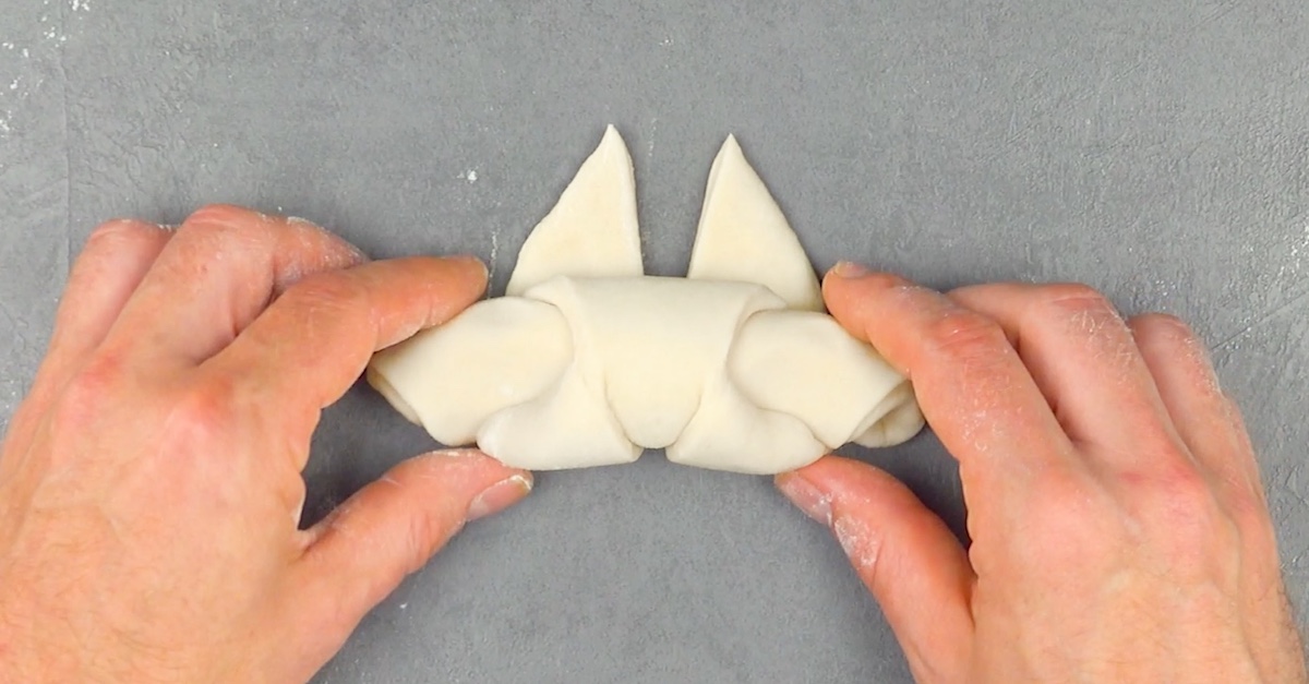 5.3 Rolle den Teig nun zu den Spitzen hin auf.