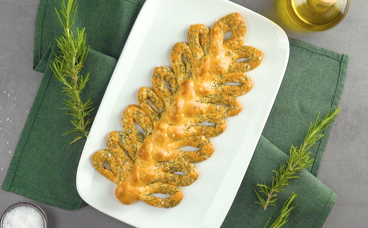7.4 Lass den Rosmarinzopf 30 Minuten ruhen, überziehe ihn dann mit Eistreiche und backe ihn anschließend für 20 Minuten bei 180 °C Ober-/Unterhitze goldbraun.