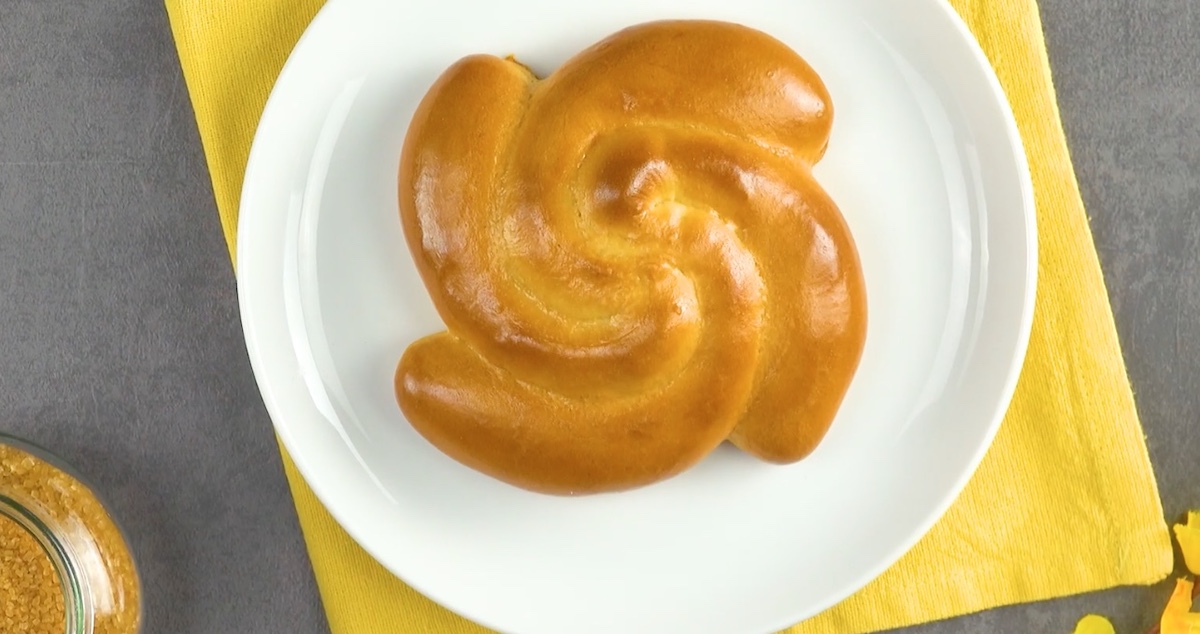 6.3 Lass die Teigspirale für 30 Minuten ruhen, bevor du sie mit Eistreiche überziehst und für 20 Minuten bei 180 °C Ober-/Unterhitze goldbraun bäckst.