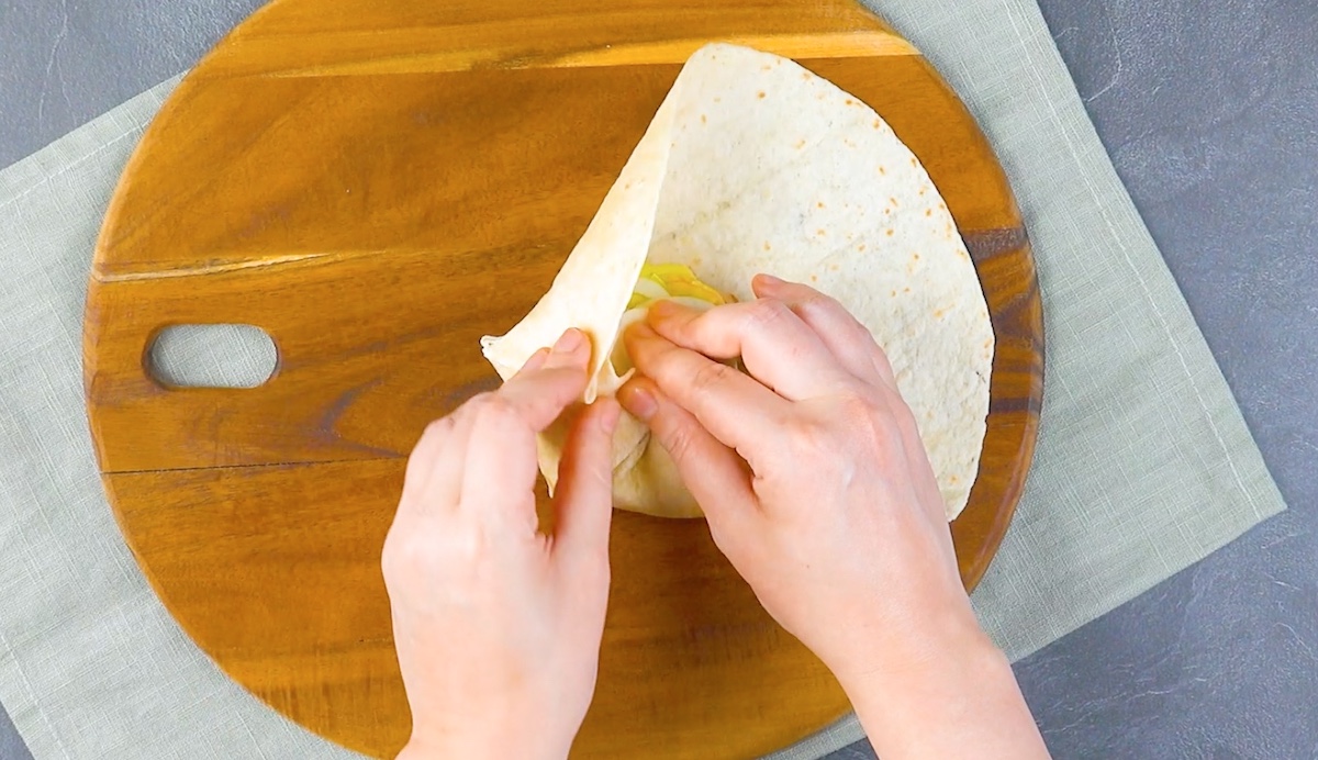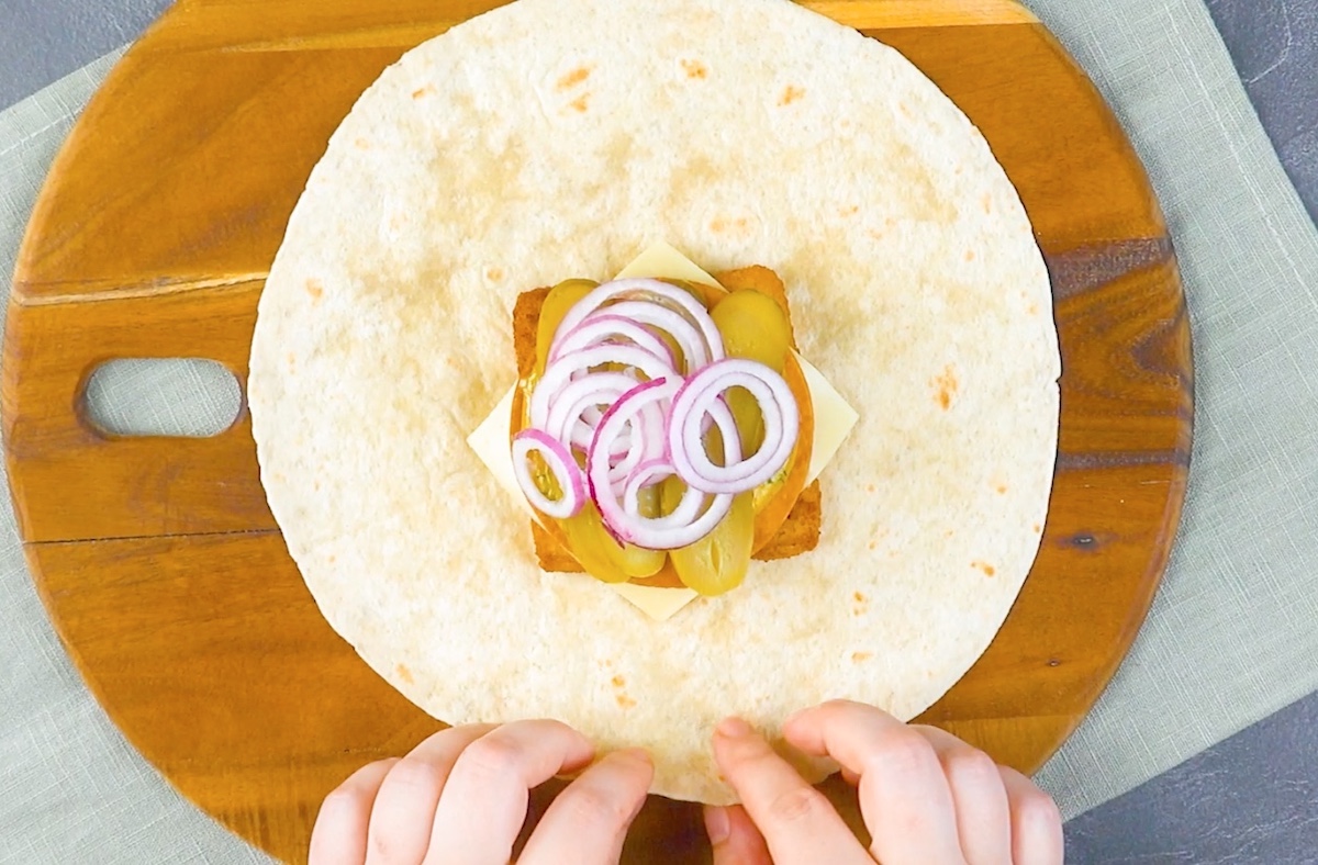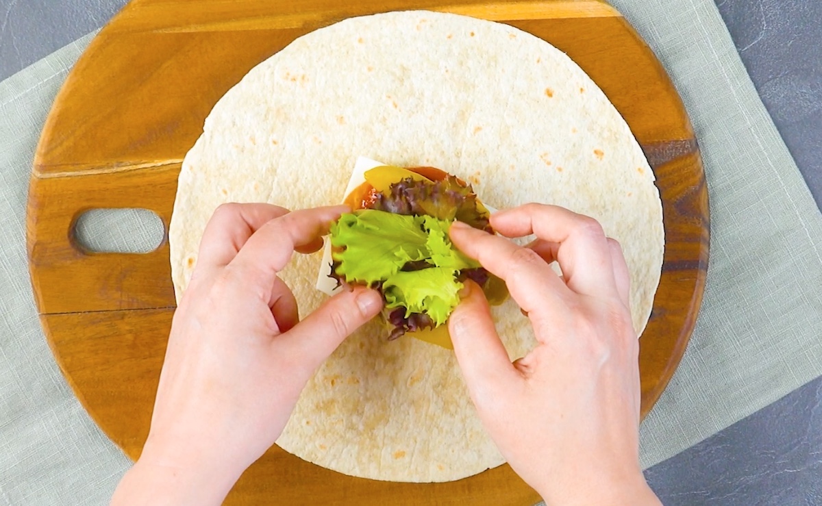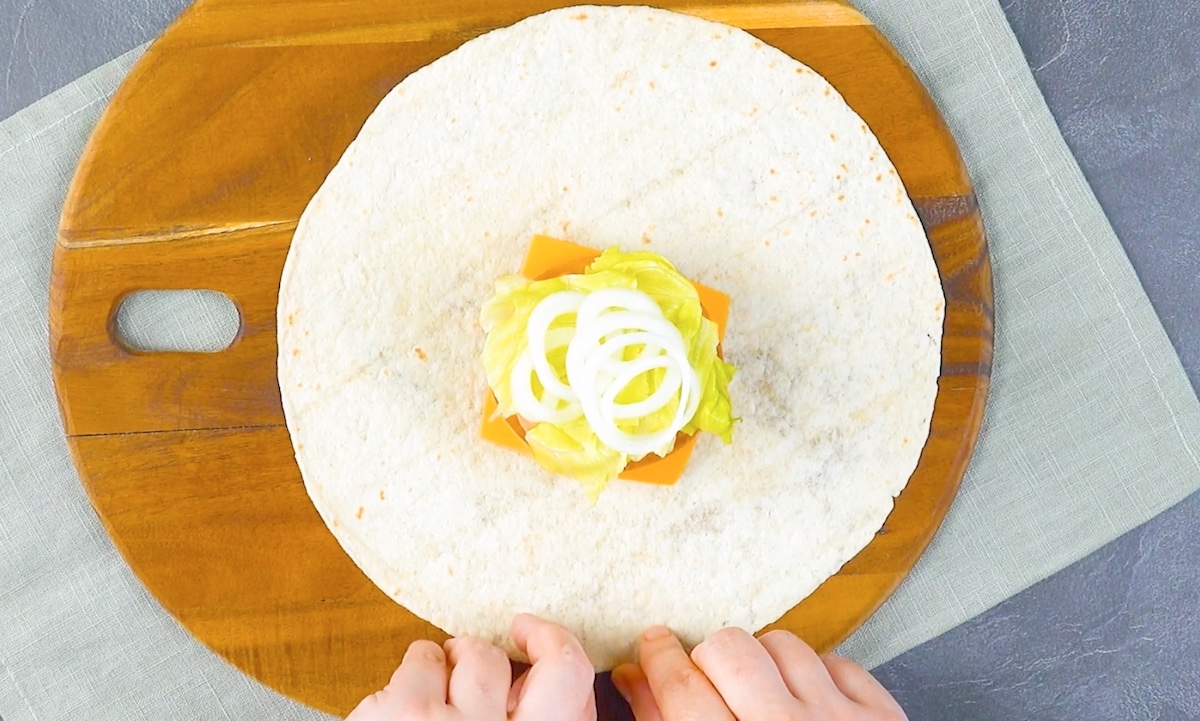Nachdem du dich für eine der Crunchwrap-Burger-Varianten entschieden hast, lege alle dafür benötigten Zutaten der Reihe nach mittig auf eine Tortilla, falte die Tortilla dann, wie im Video gezeigt, rundherum überlappend zusammen.