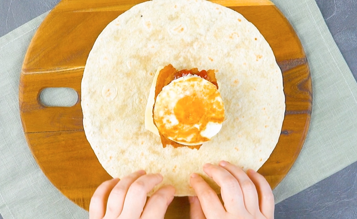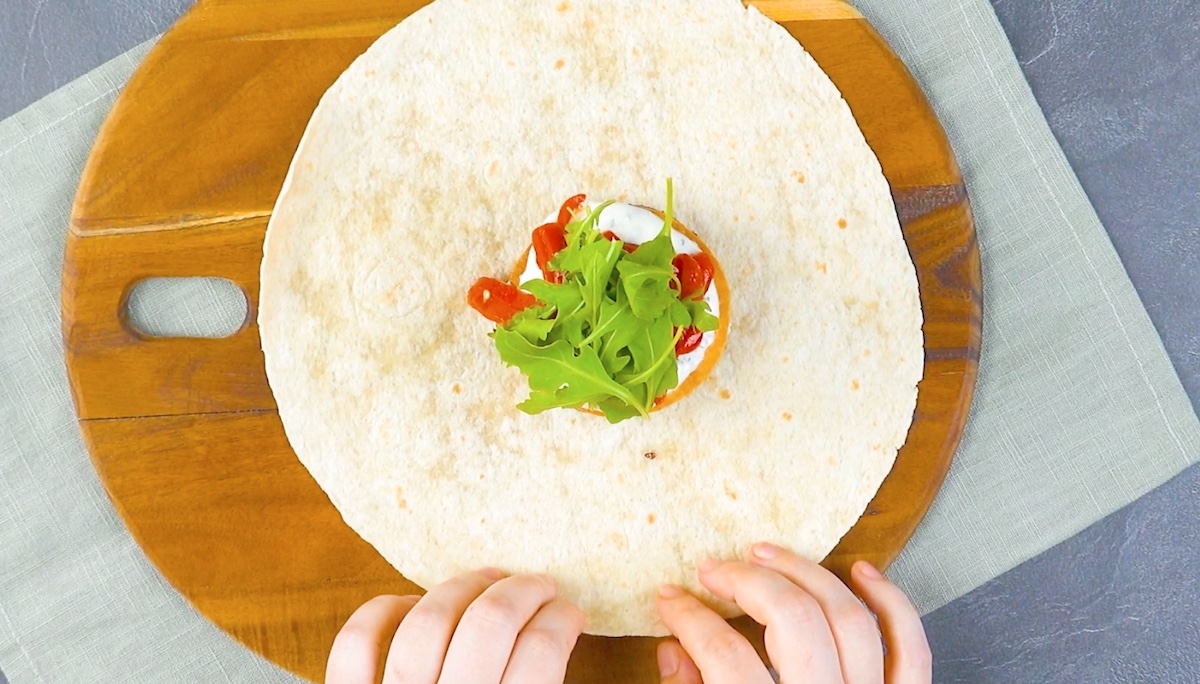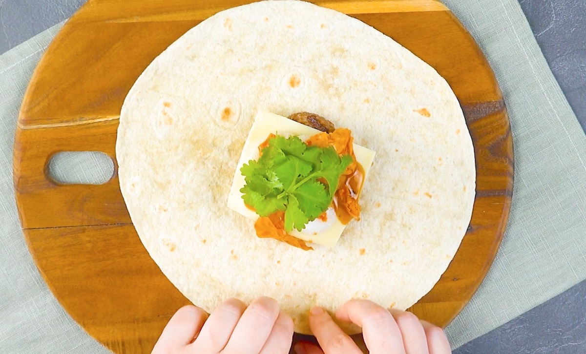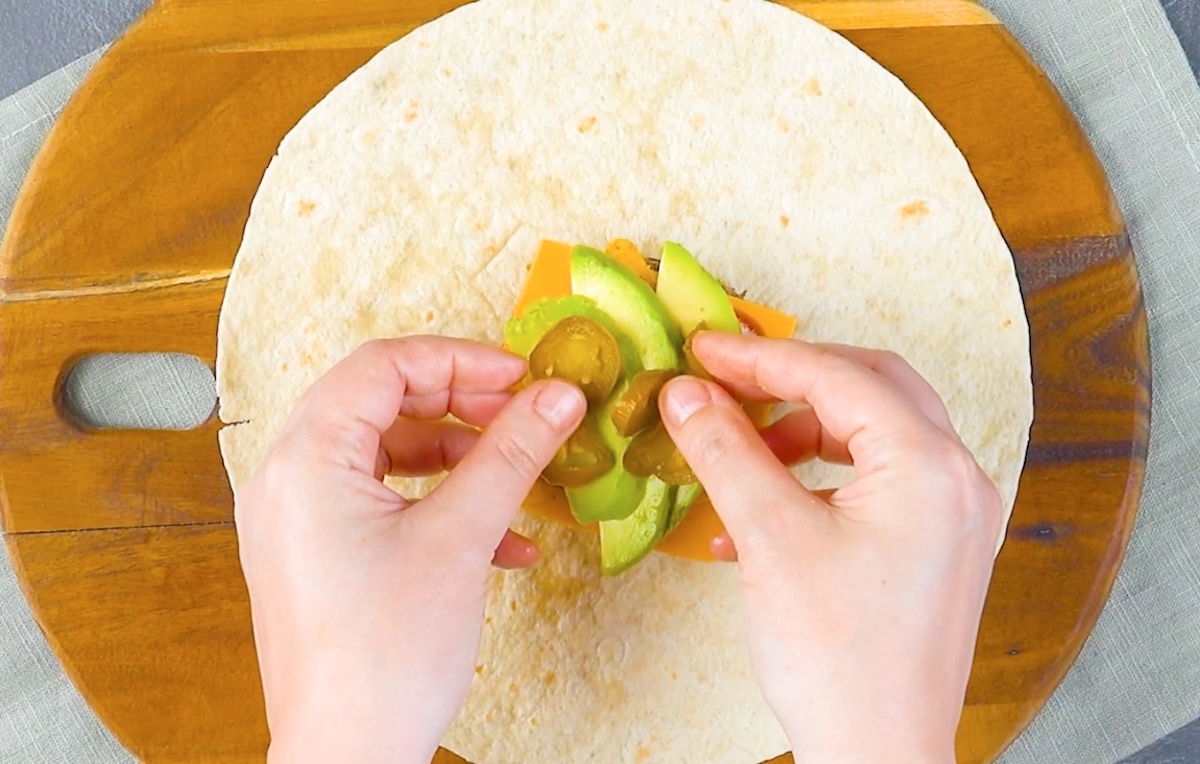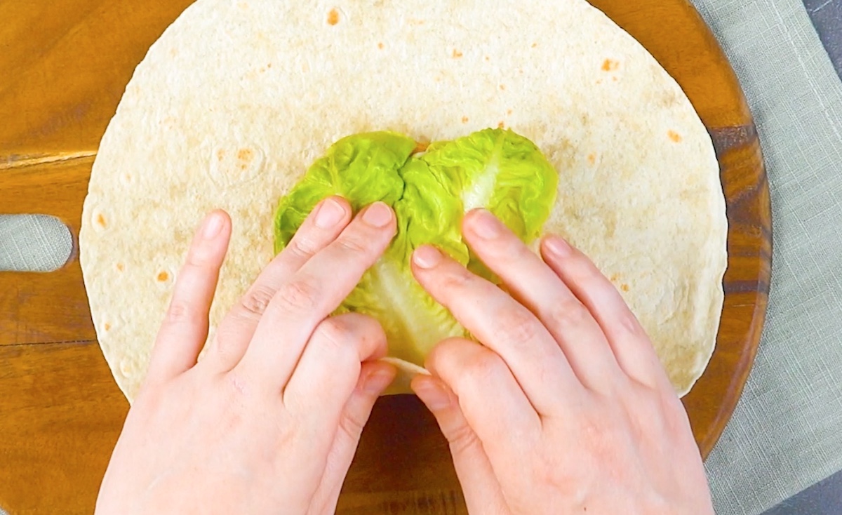 Nachdem du dich für eine der Crunchwrap-Burger-Varianten entschieden hast, lege alle dafür benötigten Zutaten der Reihe nach mittig auf eine Tortilla, falte die Tortilla dann, wie im Video gezeigt, rundherum überlappend zusammen.