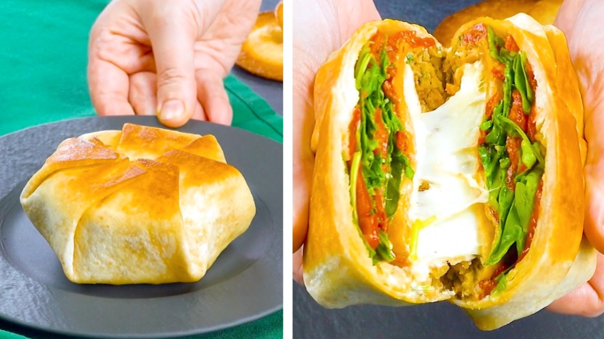Für knusprige Burger sind Tortillas die beste Grundlage: Belege Tortillas einfach mit deinen liebsten Burger-Zutaten und falte sie zusammen. Das Ergebnis? Knusprig-leckere Crunchwrap-Burger!