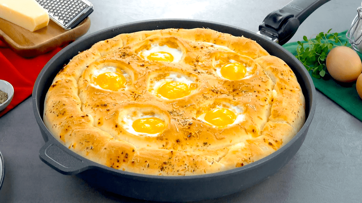 Ganz gleich, ob du eine Tiefkühlpizza oder eine selbstgemachte Pizza in den Ofen schiebst – das Prinzip ist immer das gleiche: Der Pizzateig wird mit Soße bestrichen, individuell belegt und mit Käse bestreut. Unsere Pfannenpizza ist mal etwas ganz anderes! Denn unser selbstgemachter Pizzateig ist nicht nur der Pizzaboden, etwa ein Drittel kommt nämlich durchlöchert oben auf den Belag. Verschlossen werden die Löcher dann mit Eiern – klingt interessant, oder? Dann halte dich fest, denn das ist nicht die einzige Besonderheit unserer Pfannenpizza. In ihrem Rand verbirgt sich nämlich Mozzarella in Würfelform!