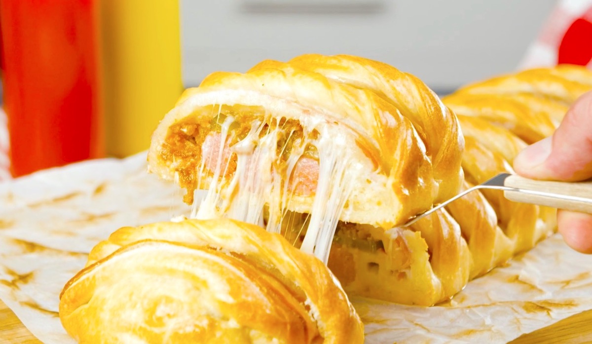 9. Mit Bacon umwickeltes Hotdog-Brot Stell dir vor, es gäbe einen Hotdog, der zum einen extrem groß ist und zum anderen auch noch mit Bacon umwickelt ist … Das klingt nach einer himmlischen Hotdog-Version, nicht wahr? Dachten wir auch, und deswegen haben wir uns in die Küche gestellt und diese XXL-Traumvorstellung umgesetzt. Wir bereiten ein selbstgemachtes Hotdog-Brot zu, gefüllt mit Rindswurst, geriebenem Käse, Röstzwiebeln und Gurken. Ein Muss für alle Liebhaber von Hotdogs! Hier geht es zu dem Rezept für das riesige Hotdog-Brot.