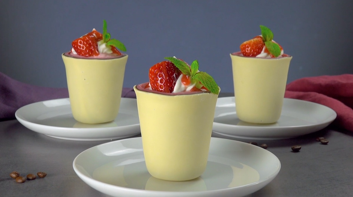 Habt ihr schon einmal Ruby-Schokolade probiert? Schokolade aus der Ruby-Kakaobohne ist rosa und hat einen ganz besonderen Geschmack. Perfekt also für unser farbenprächtiges Dessert! Die leckeren Becher aus drei Schichten Schokolade sind nicht nur ein richtiger Hingucker, sie sind in der Kombination mit Erdbeeren und Sahne auch ausgesprochen köstlich.
