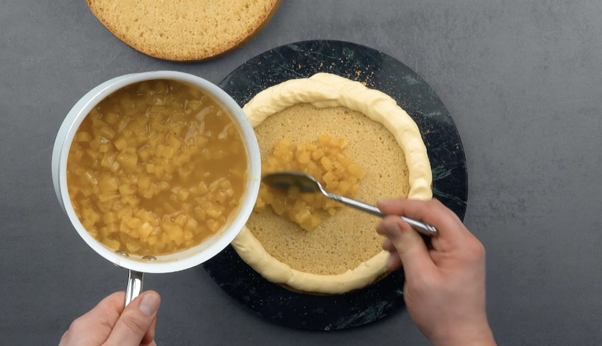 6.) Lege einen weiteren Kuchenboden auf den ersten und gib auf dieselbe Weise Frosting und Ananaswürfel darauf.