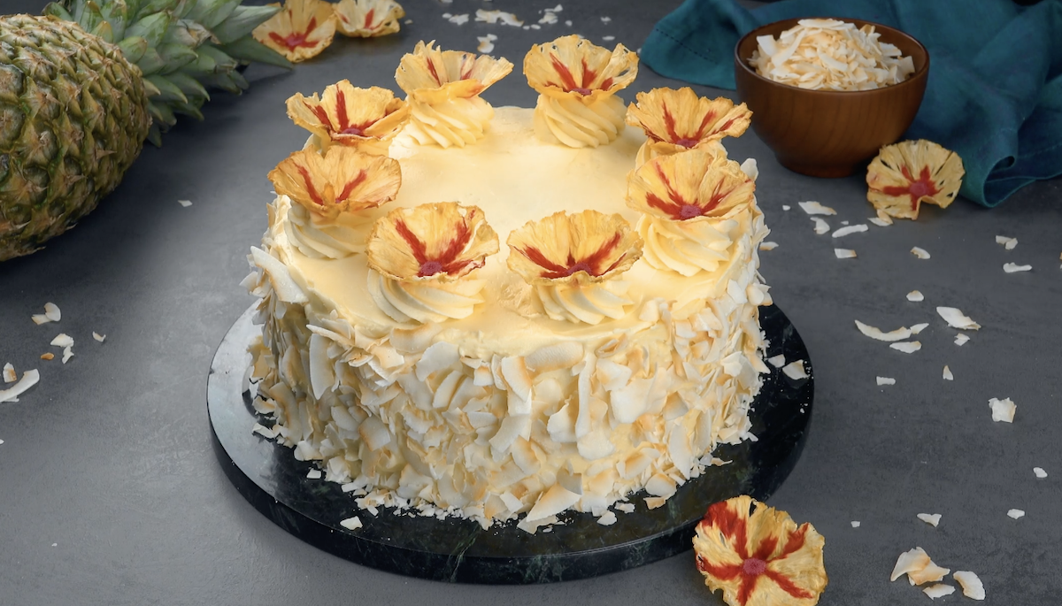 Es gibt zwei Dinge, die kulinarisch einfach zusammengehören – und zwar die Ananas und die Kokosnuss. Egal, ob Piña colada oder Ananas-Kokos-Dessert: Selten passen zwei Lebensmittel so hervorragend zusammen. Folgendes Rezept vereint beide Komponenten in einem Ananaskuchen mit knusprigen Kokosraspeln und einer hübschen Blütenzierde. Der Clou an dem Kuchen ist, dass man die Zierde ebenfalls vernaschen kann.