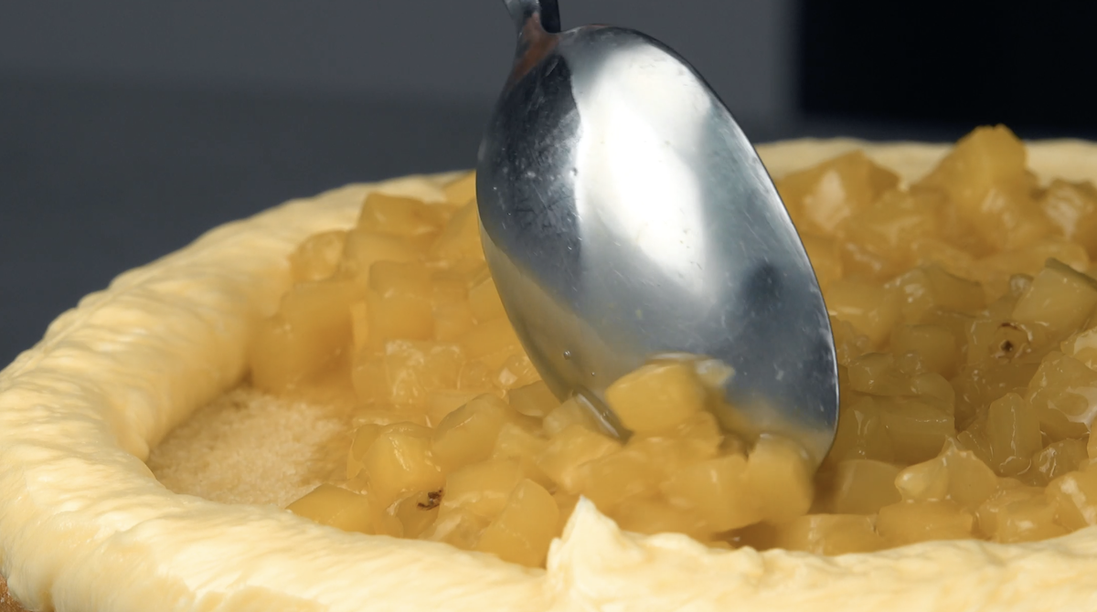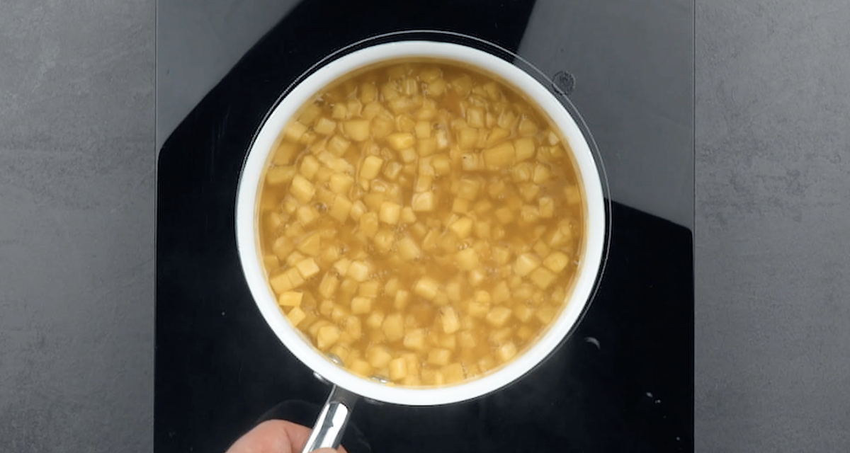 3.) Schneide den Rest der Ananas in kleine Würfel. Gib braunen Zucker in einen Topf und lasse ihn karamellisieren. Rühre Stärke mit einem Schluck Orangensaft an und gib das Gemisch und den restlichen Orangensaft zusammen mit den Ananaswürfeln in den Topf zu dem braunen Zucker hinzu. Lasse alles etwa 2-3 Minuten zusammen kochen. Stelle den Topf dann erst einmal beiseite und lasse alles abkühlen.