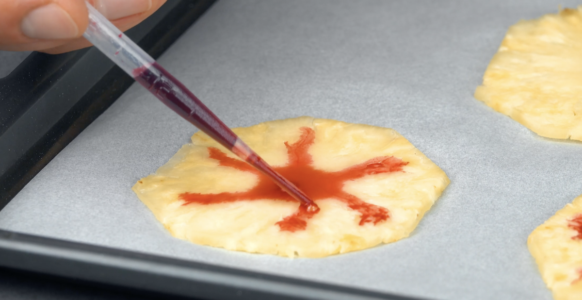 2.) Schäle eine Ananas und schneide 8 Scheiben von ca. 3 mm Dicke ab. Lege diese Scheiben nun auf ein mit Backpapier ausgelegtes Backblech. Ziehe dann mit einer Pipette Kirschsaft auf und „male“ ein Sternenmuster auf die Fruchtscheiben. Lasse diese anschließend im leicht geöffneten Ofen bei 120 °C Umluft ca. 90 Minuten trocknen. (Klemme am besten einfach einen Kochlöffel in die Ofentür.)