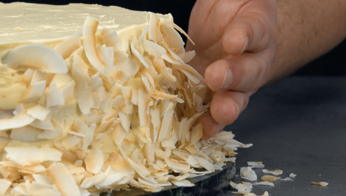 8.) Verteile an den Seiten die gerösteten Kokosraspel.