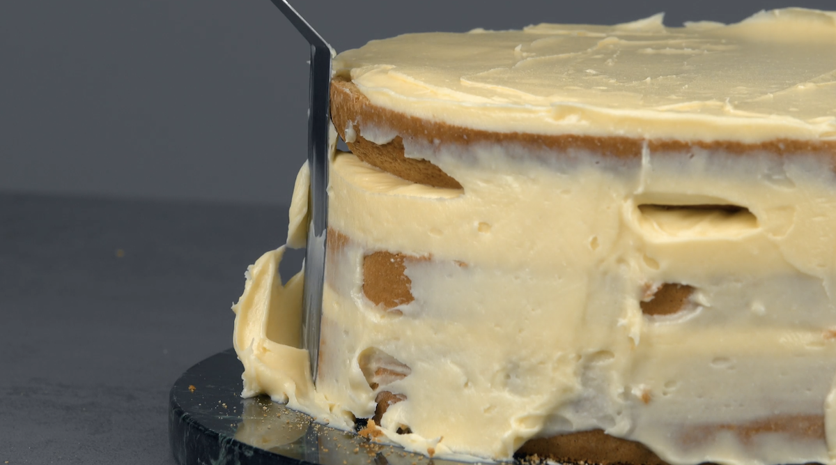 7.) Lege den dritten Kuchenboden obenauf und bestreiche den Kuchen rundherum komplett mit Frosting.