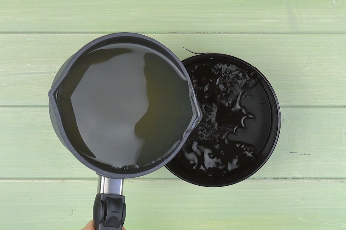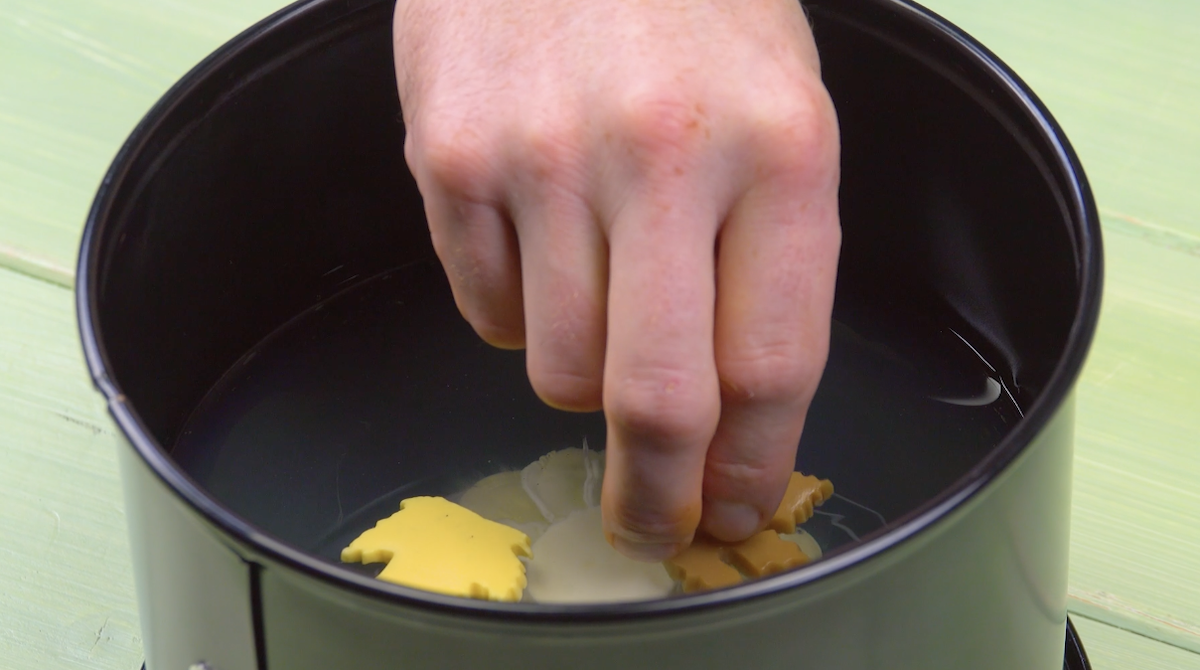 8. Setze den Ring wieder auf die Kuchenform und gib das restliche Apfelgelee aus Punkt 1 etwa 3 cm dick in die Form. (Das Gelee wird wieder weich, wenn du es erwärmst.) Stelle die Form nochmals für 60 Minuten in den Kühlschrank. Löse dann die fest gewordenen Blätter aus der Silikonform und lege sie mit der flachen Seite nach oben auf das Gelee in der Kuchenform. Gib vorsichtig das restliche, flüssige Apfelgelee mit in die Form, bis die Blätter vollständig bedeckt sind. Stelle die Form nochmal für 2 Stunden in den Kühlschrank.
