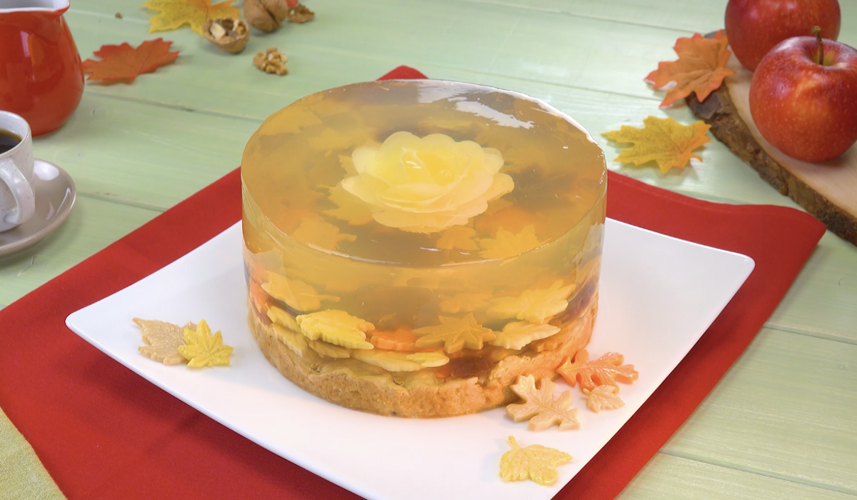 1. Weiche die Gelatine in Wasser ein und erwärme Apfelsaft in einem Topf auf ca. 65 °C. Füge die Gelatine hinzu und lass alles auf 30 °C herunterkühlen. Gieße etwa die Hälfte des Apfelgelees in eine Springform mit hohem Ring und lass es über Nacht im Kühlschrank auskühlen. Den Rest stellst du ebenfalls im Kühlschrank kalt.