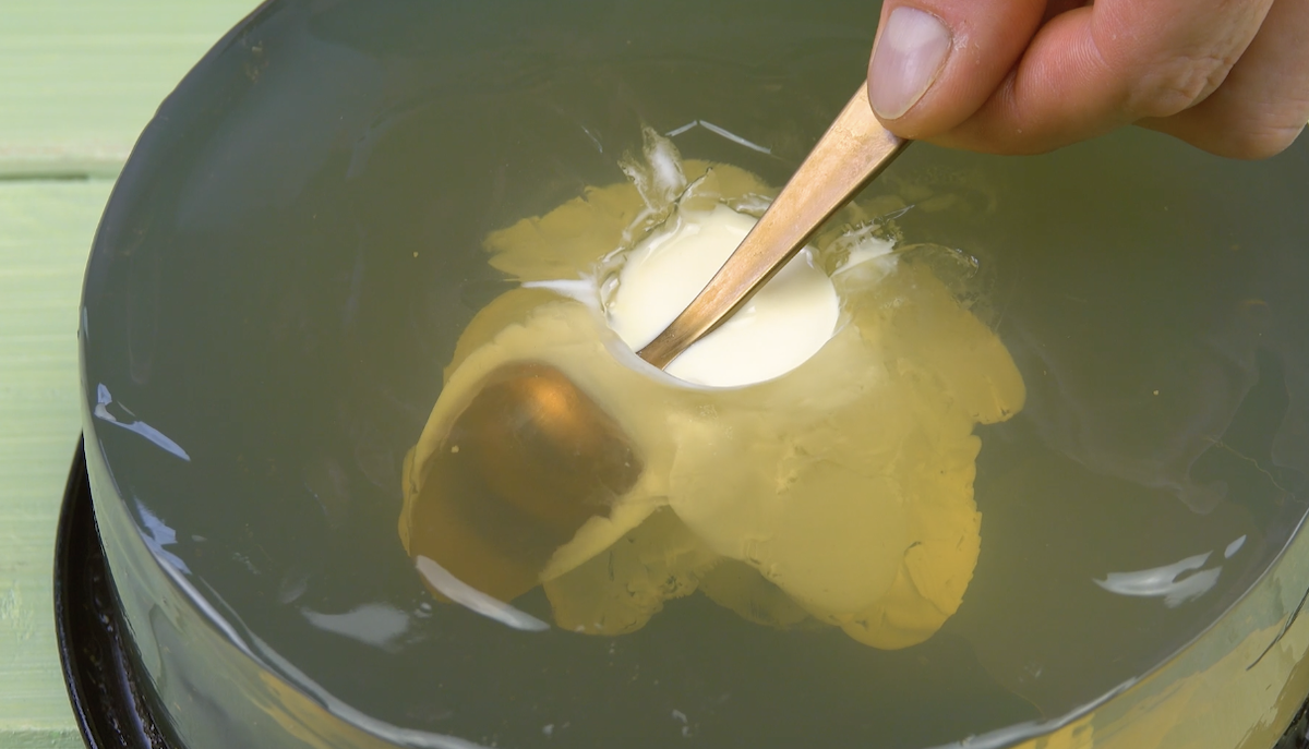 7. Nimm die Kuchenform mit dem Apfelgelee (aus Punkt 1) aus dem Kühlschrank und entferne den Ring. Stich mit einem Kugelausstecher mittig ein Loch heraus. Befülle das Loch zu drei Vierteln mit dem gelben Vanille-Zimt-Gelee. Stich nun mit einem warmen, trockenen Löffel ganz vorsichtig in das Apfelgelee hinein, sodass das gelbe Gelee in das Apfelgelee hineinfließt. Wiederhole das versetzt so lange (erst mit dem gelben, dann mit dem weißen Gelee), bis optisch eine Blume entstanden ist. Stelle die Form noch einmal für 30 Minuten in den Kühlschrank.