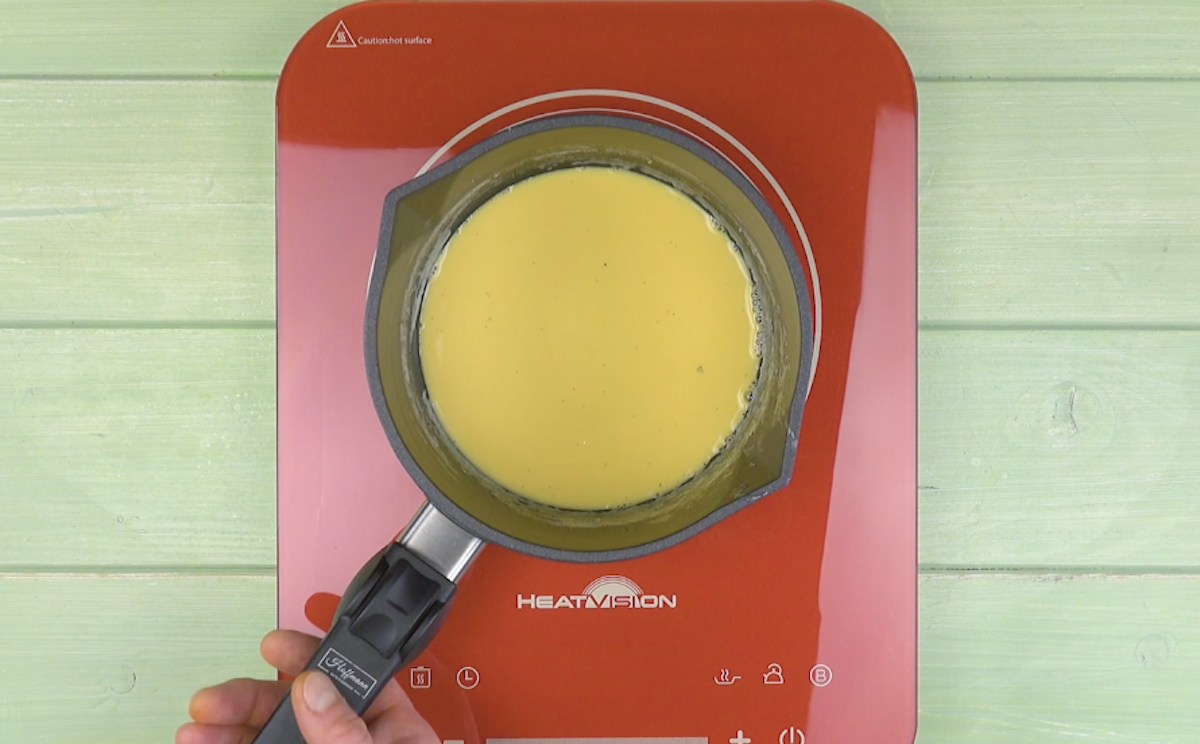 4. Für das Dulce-de-leche-Gelee weichst du wieder Gelatine in Wasser ein. Erhitze die Milch und das Dulce de leche in einem Topf und lass es auf 65 °C herunterkühlen. Füge eingeweichte Gelatine hinzu, lass abermals alles auf 30 °C herunterkühlen und fülle es in die Blattform.