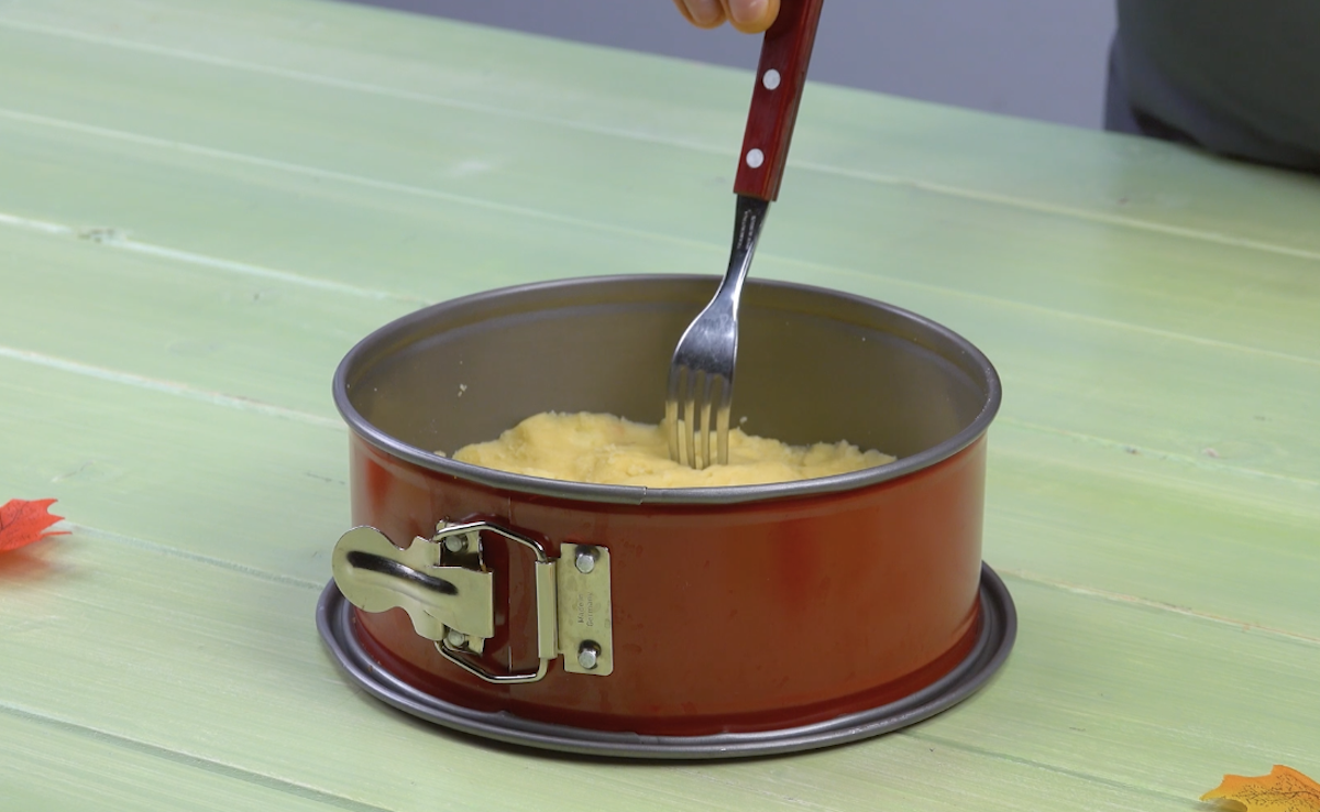 6. Kommen wir nun zum Kuchenboden. Rühre die Butter mit dem Zucker cremig. Gib dann Apfelwürfel, Puderzucker, Mehl und Salz hinzu und verarbeite alles zu einem Mürbeteig. Verteile den Teig in einer Springform (Durchmesser: 19 cm) und stich mit der Gabel ein paarmal hinein. Stelle die Springform bei 160 °C Ober- und Unterhitze für 30 Minuten in den vorgeheizten Backofen. Lass den Kuchenboden anschließend abkühlen.