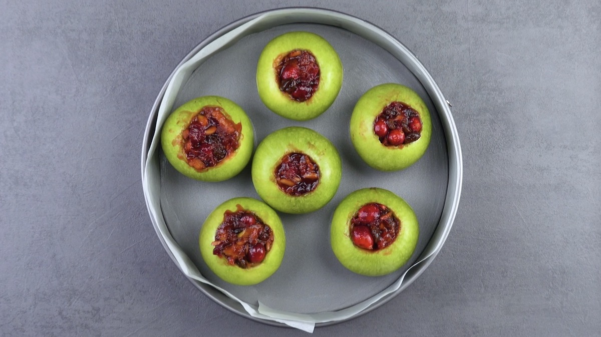 3.) Fette den Boden einer Springform ein und verkleide ihren Rand mit Backpapier. Fülle die Äpfel mit der fruchtigen Mischung und stelle sie mit der Öffnung nach oben in die Springform.