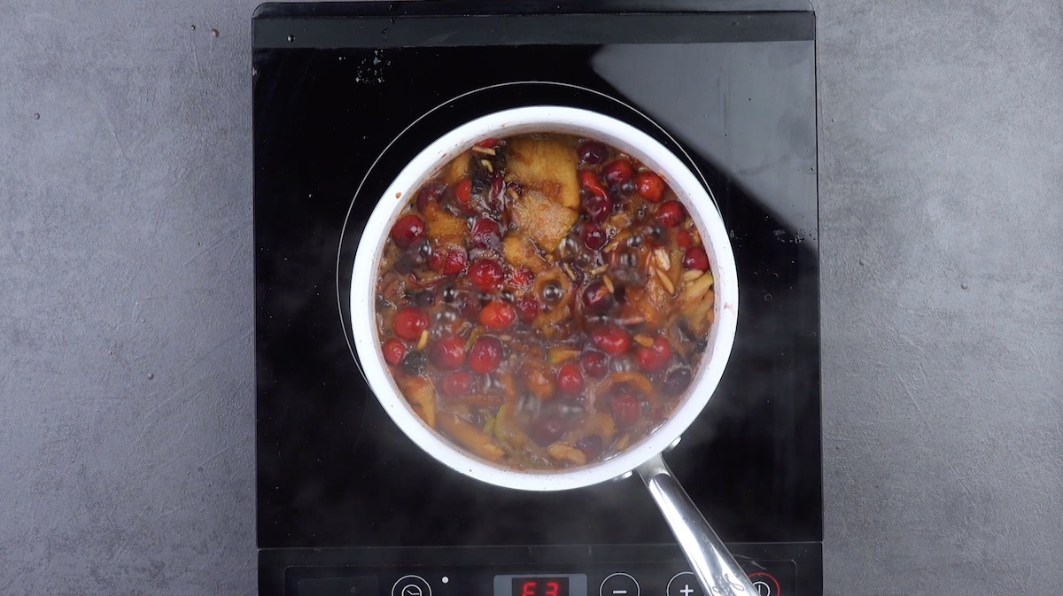 2.) Karamellisiere den braunen Zucker. Lösche ihn mit Rotwein ab und verrühre das Ganze mit Cranberrys, Mandelstiften, Rosinen, Zimt sowie dem Fruchtfleisch der Äpfel. Koche die Masse kurz auf und lass sie anschließend abkühlen.