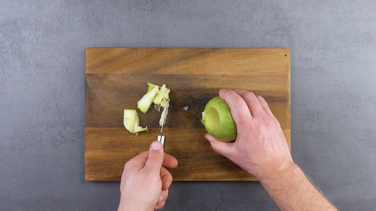 1.) Wasche und entkerne die Äpfel; achte darauf, etwas mehr Fruchtfleisch mit auszuschaben, und hebe dieses auf.