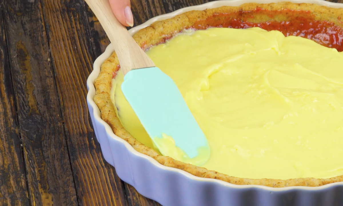4.) Als Nächstes bestreichst du den fertiggebackenen Boden mit Erdbeerkonfitüre. Darauf verteilst du den Pudding.