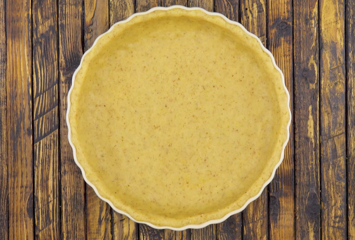1.) Verknete Mehl, Pekannüsse, Butter, Ei und Zucker zu einem Teig. Forme ihn zu einer Kugel und breite ihn sorgfältig in einer Quicheform aus.