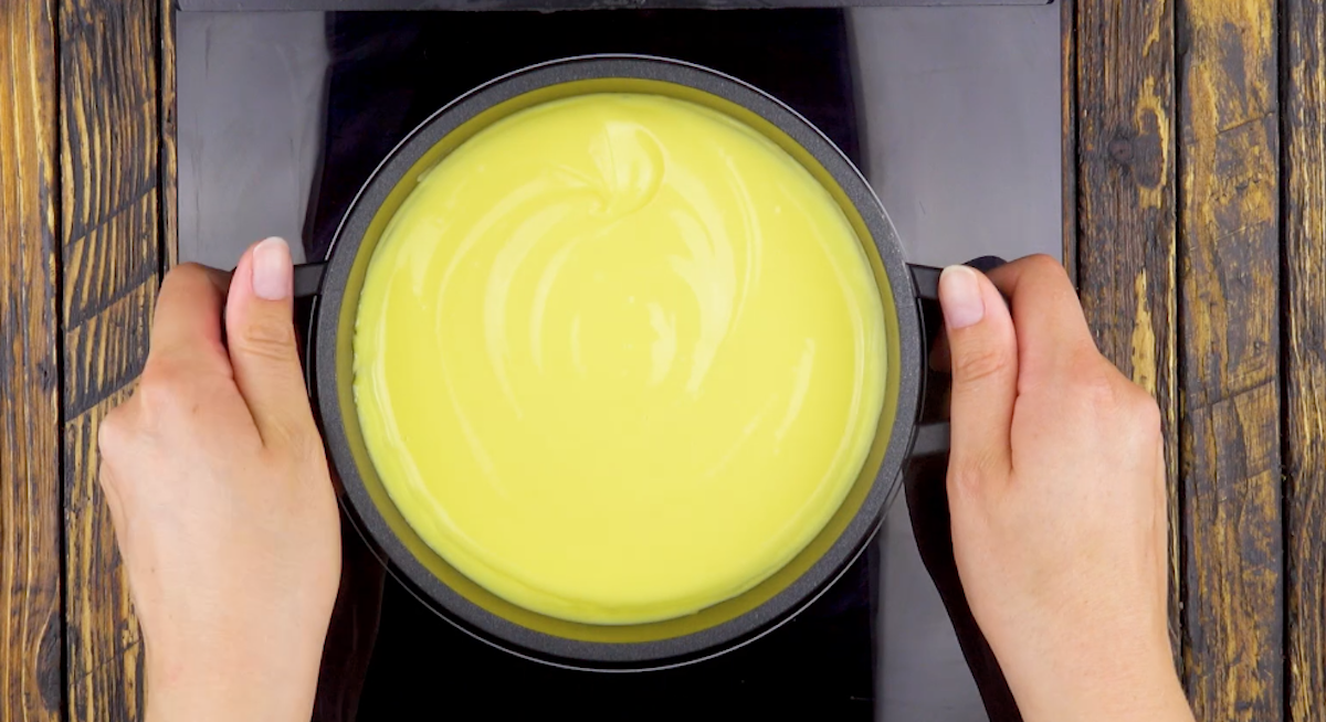 3.) Erhitze derweil Milch und Zucker, rühre einige Löffel davon unter das Puddingpulver und füge dieses dann zur restlichen Milch. Unter Rühren kochst du den Pudding auf, bis er eingedickt ist.