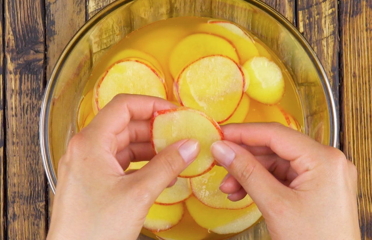 5.) Schneide mehrere ungekühlte Äpfel in möglichst dünne Scheiben. Diese gibst du mitsamt dem Orangensaft und der Butter in eine große Schüssel. Die Mischung macht die Scheiben flexibel, damit sie beim späteren Rollen nicht brechen. Gleichzeitig bleibt aber das strahlende Rot der Schale erhalten, weil keine Hitze zum Einsatz kommt.