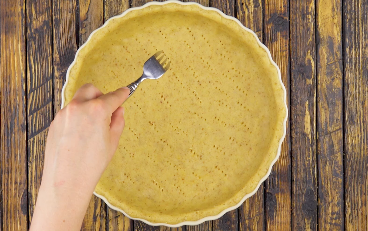 2.) Mit einer Gabel stichst du den Boden gleichmäßig ein, ehe der Teig bei 160 °C für 25 Minuten gebacken wird. Die Löcher im Boden sorgen dafür, dass Luft unter dem Teig entweichen kann, und helfen dabei, ihn gleichmäßig zu backen.