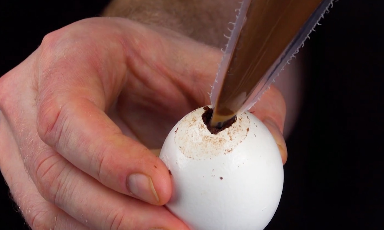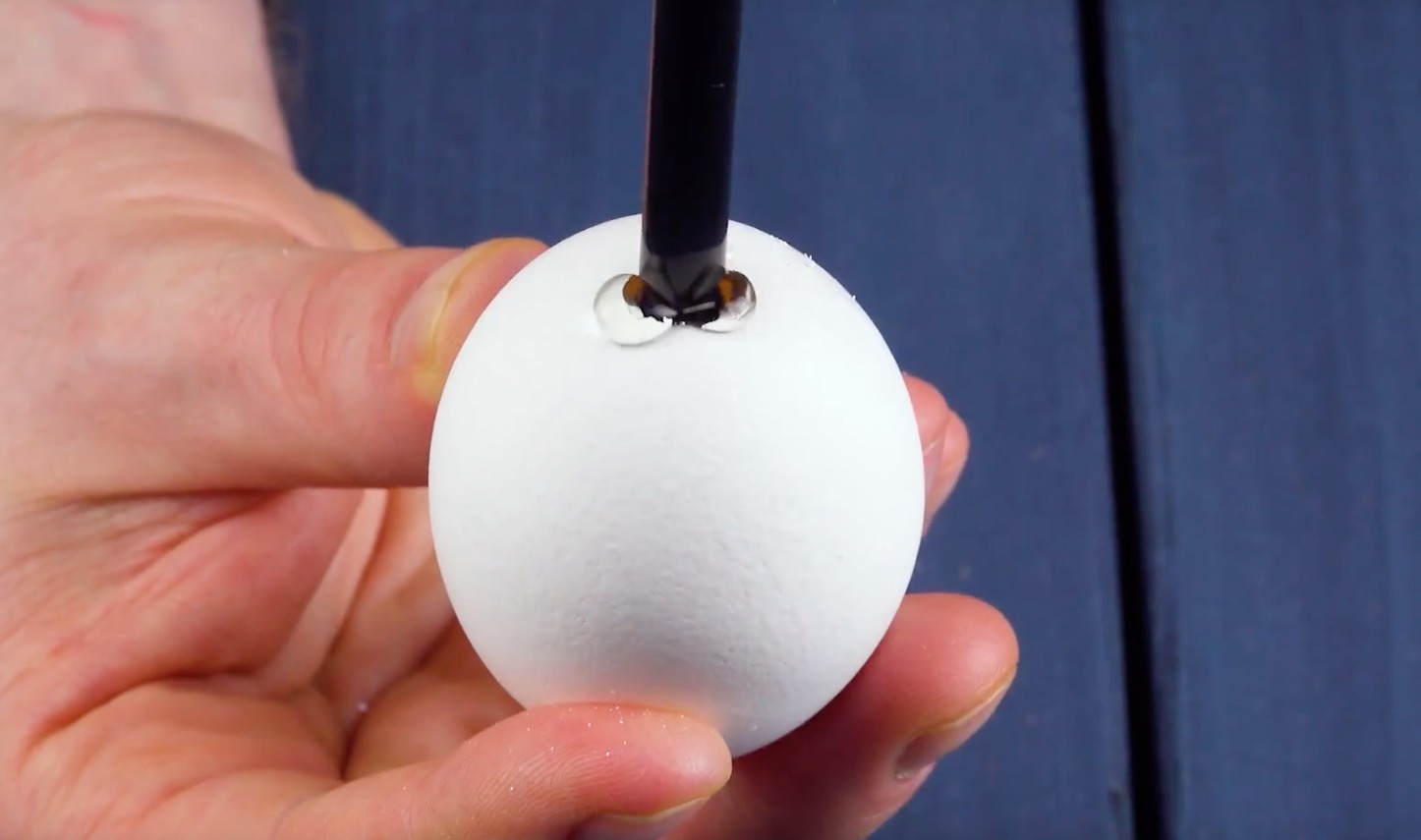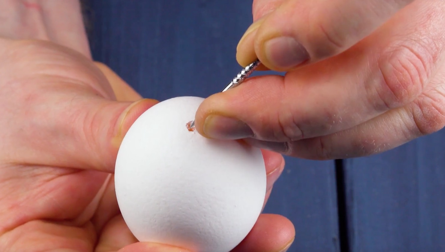 Reinige in einem ersten Schritt die Eier, z.B. mit warmem Wasser und Spülmittel. Stich dann mit dem Nagel ein Loch in das flache Ende des ersten Eis und vergrößere das Loch bis auf einen Durchmesser von etwa 1 cm.