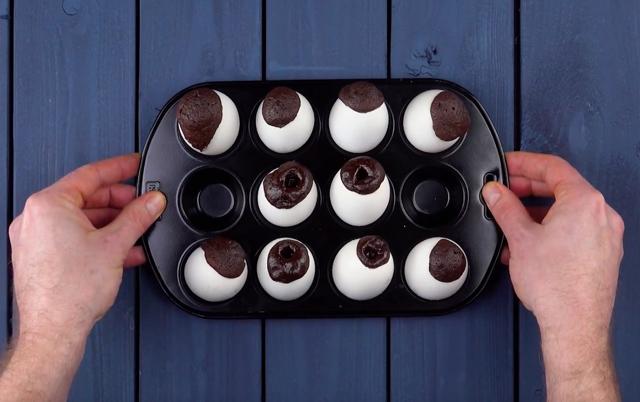 Fülle den Teig dann in einen Spritzbeutel. Mit dessen Hilfe werden die Eier zu etwa 3/4 mit Teig gefüllt. Backe sie anschließend 15 bis 20 Minuten bei 180 °C.