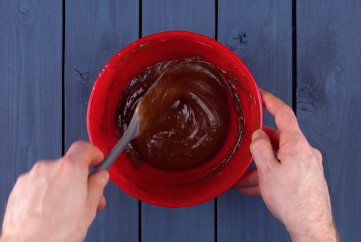 Gib nun die Schoko-Butter-Mischung zum Teig, siebe das Mehl zusammen mit dem Kakao dazu und vermenge alles zu einem glatten, recht flüssigen Teig.