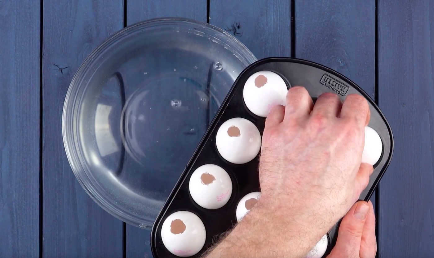 Spüle dann die hohlen Eier aus und lege sie für mindestens 30 Minuten in eine Schüssel mit kaltem Salzwasser. Bestücke dann die Mini-Muffinform mit den Eiern und lasse sie bei ca. 50 °C im Backofen trocknen. Heize den Ofen dann auf 180 °C im Ober-und-Unterhitze-Modus vor.