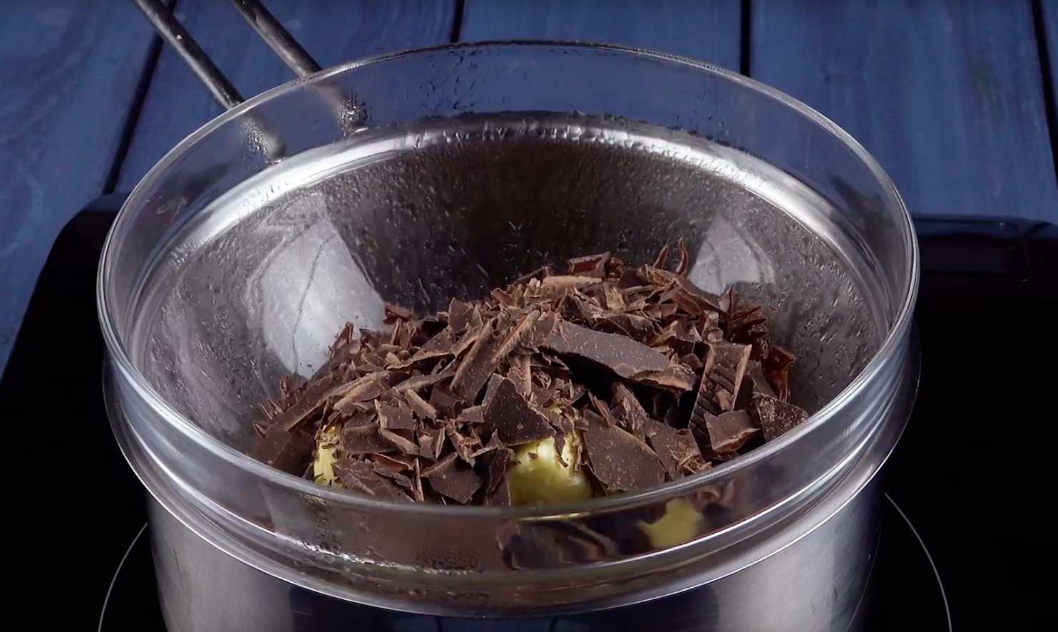 Jetzt geht es an die Zubereitung des Teigs: Lass dafür zunächst die zerkleinerte Schokolade zusammen mit der Butter im Wasserbad schmelzen.