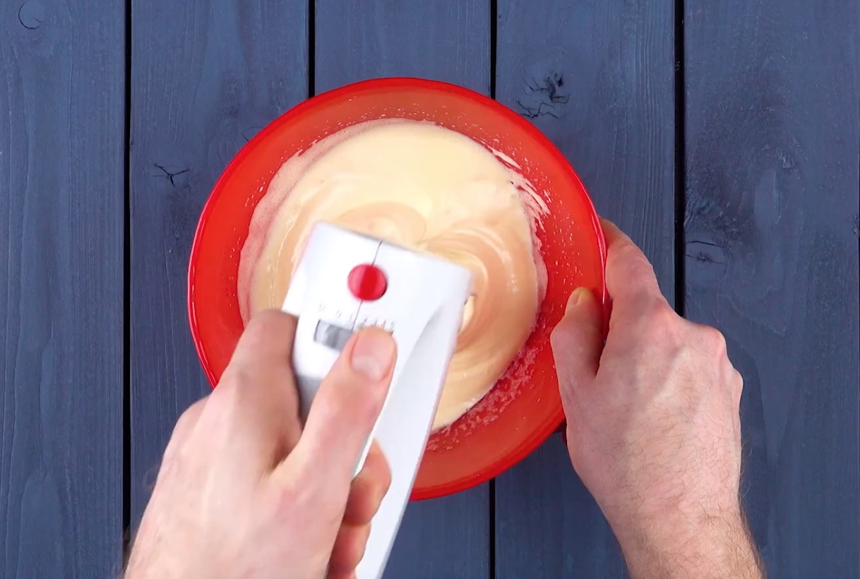 Verquirle nun die 2 Eier, die du vorher zur Seite gestellt hast, mit einem Handrührgerät unter Beifügung von Zucker und Salz. Rühre weiter, bis du eine schaumige Masse erhältst.