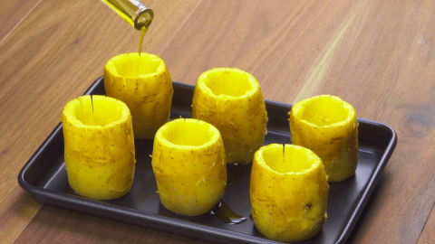- Beträufele die Kartoffeln mit Olivenöl und streue etwas Salz auf sie. So grillst du die Kartoffeln aufrecht stehend bei 200 °C für 40 Minuten.