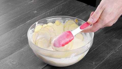 - Schneide die Kartoffeln in dünne Scheiben. Fülle sie in eine große Schüssel (nicht die gefettete!), salze und pfeffere sie gut. Dann gießt du sie mit der aufgekochten Sahne auf.