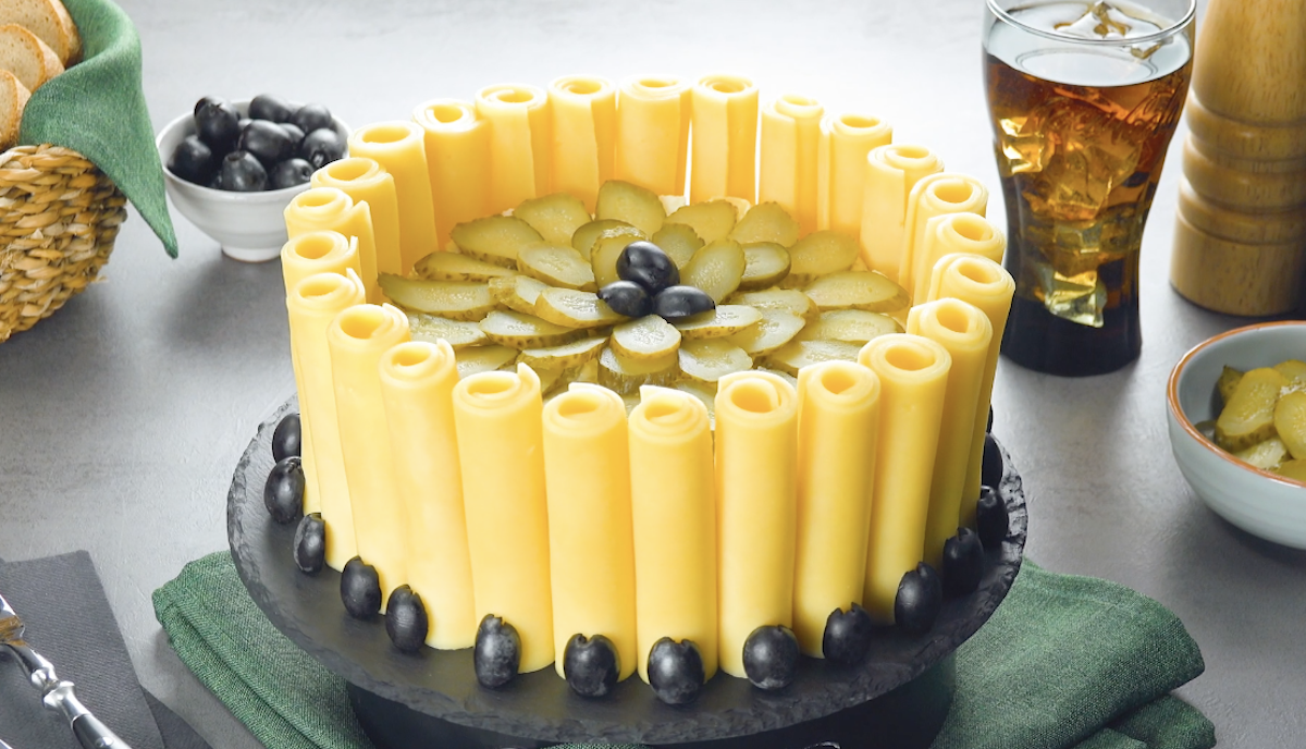 - Entferne dann den Ring der Springform. Rolle die Käsescheiben ein (wenn sie nicht halten wollen, kannst du sie leicht mit Mayonnaise bestreichen). Setze die Röllchen dann ringsherum um den Kartoffelsalat-Kuchen. Verziere ihn noch mit schwarzen Oliven.