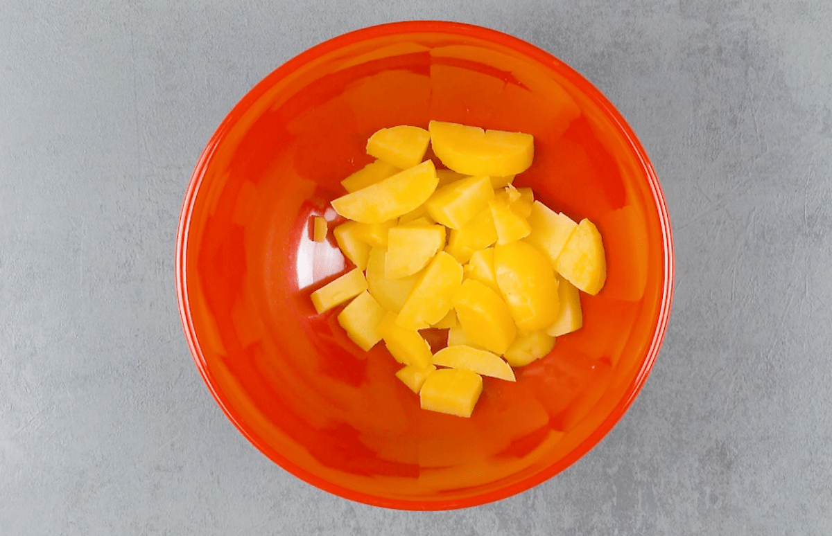 - Koche zunächst die Kartoffeln. Wenn du sie vorher rundherum mit einem Messer leicht einschneidest, geht die Pelle nach dem Kochen wunderbar ab. Schneide die Kartoffeln danach klein und gib sie in eine Schüssel.
