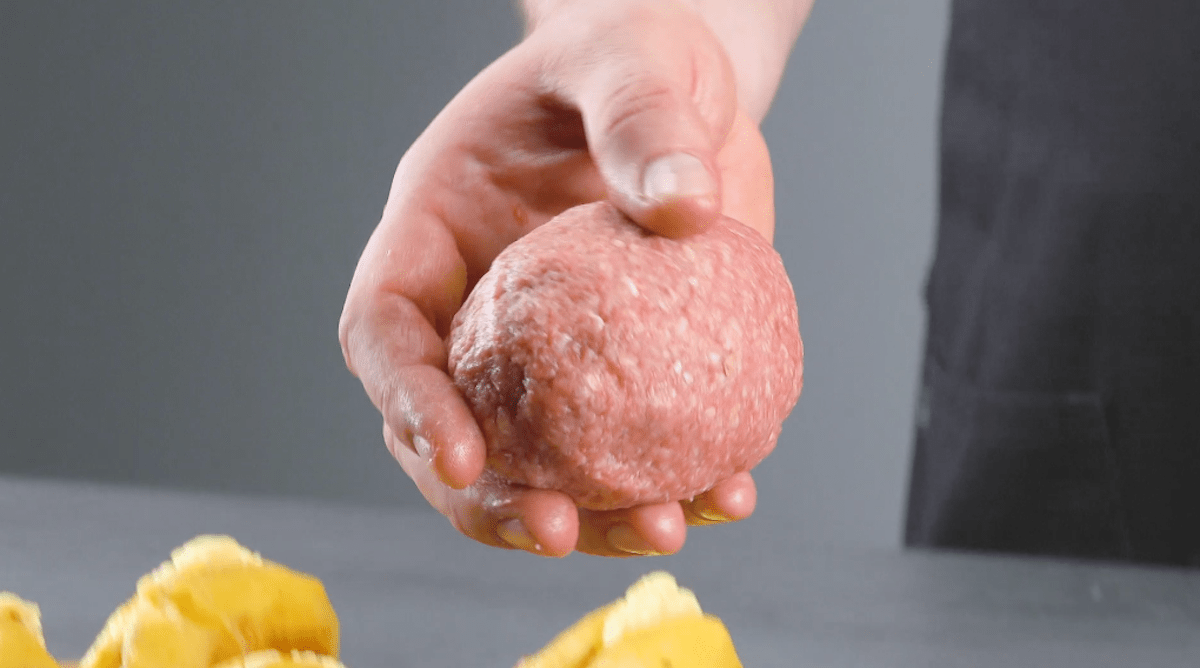 - Umschließe nun jede Kartoffel mit einem Teil der Hackmasse und drücke diese gut an.