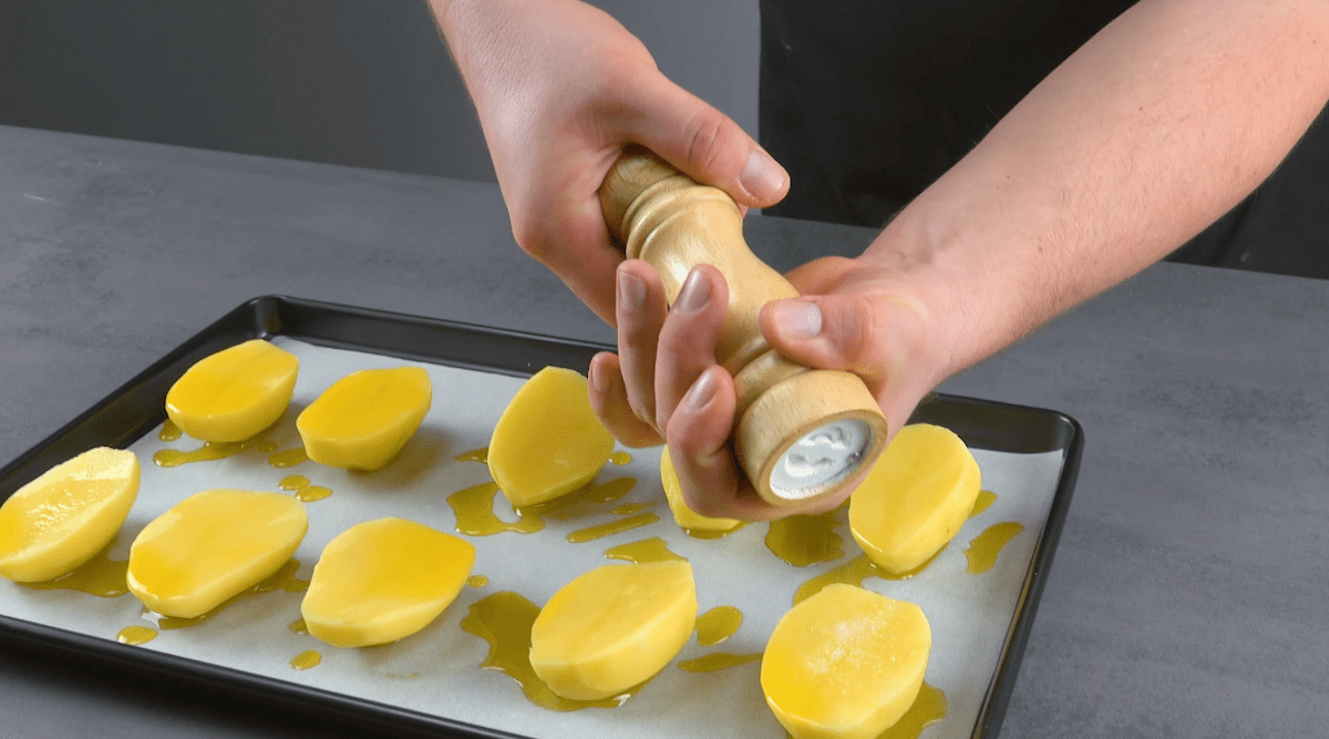 - Am besten beginnst du mit den Kartoffeln: Schäle sie und halbiere sie längs. Lege sie dann auf ein mit Backpapier ausgelegtes Backblech und beträufle sie mit Olivenöl. Würze die Kartoffelhälften mit Salz und Pfeffer. Schiebe das Blech bei 180 °C Umluft für 25 Minuten in den Ofen. (Die Kartoffeln sollten danach noch weich sein, aber schon etwas Farbe haben.)