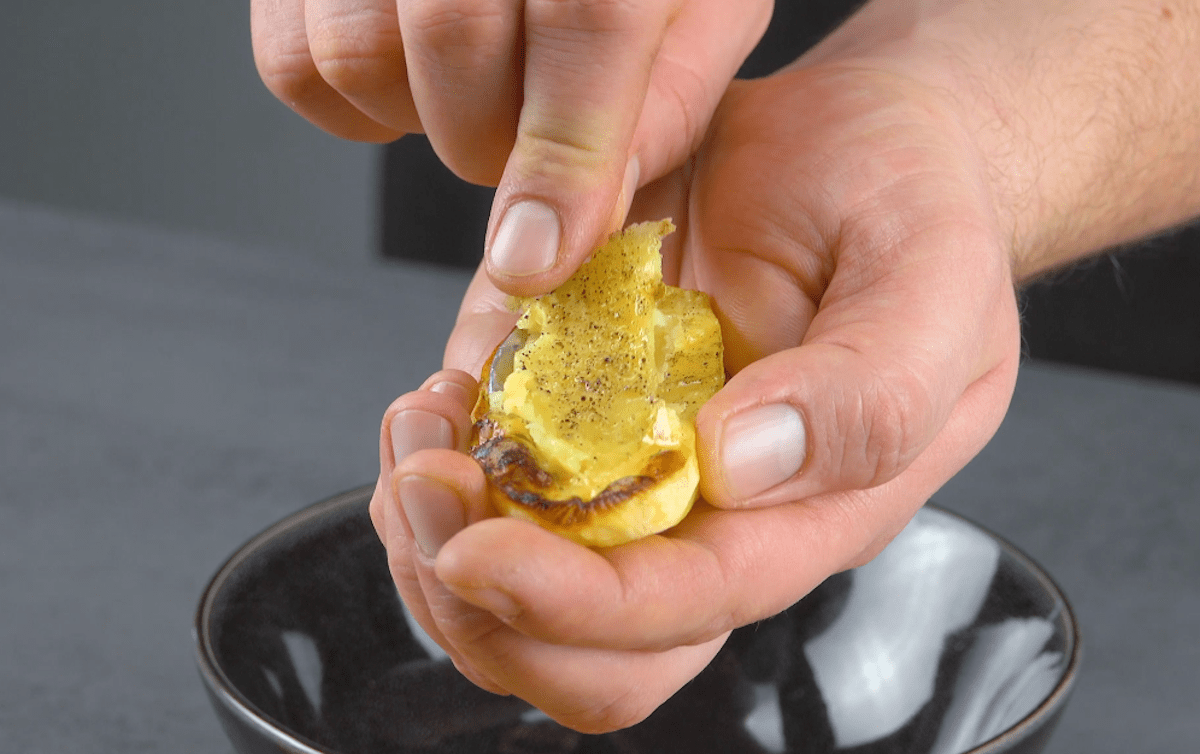 - Lasse die Kartoffelhälften etwas abkühlen und schabe sie dann mit einem Löffel aus, sodass eine Mulde entsteht.