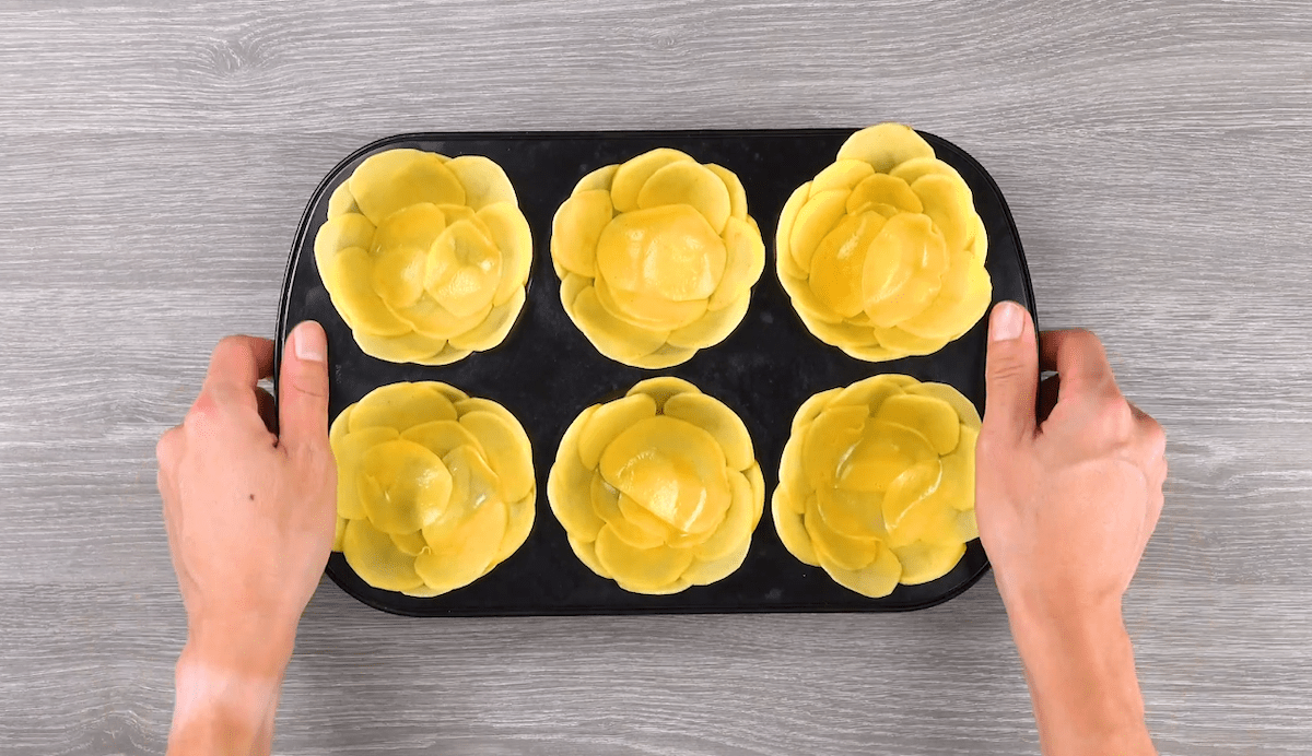 - Schichte die dünnen Kartoffelscheiben in die einzelnen Mulden der Muffinform, stelle diese anschließend in den vorgeheizten Backofen und backe sie etwa 15 Minuten bei 180 °C Umluft.Tipp: Wenn du die Kartoffelscheiben wässerst oder vorgarst, erzielst du ein noch besseres Ergebnis!