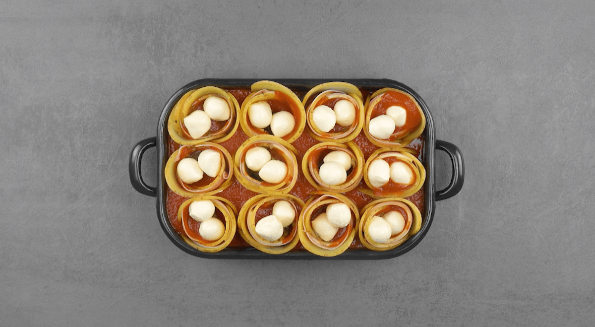 - Stelle die 12 Röllchen hochkant in eine Auflaufform und gieße Tomatensoße in alle 12 „Löcher“.