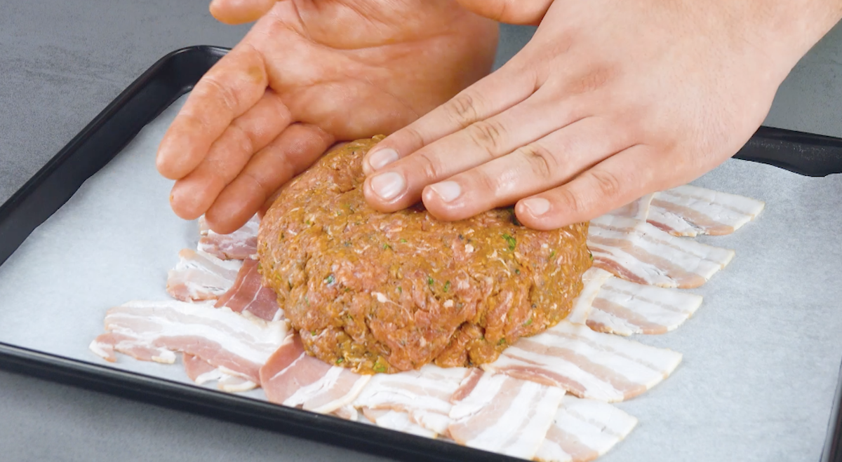 4. Klappe die überstehenden Baconstreifen auf das Hackfleisch und drehe den ganzen Baconburger einmal um.