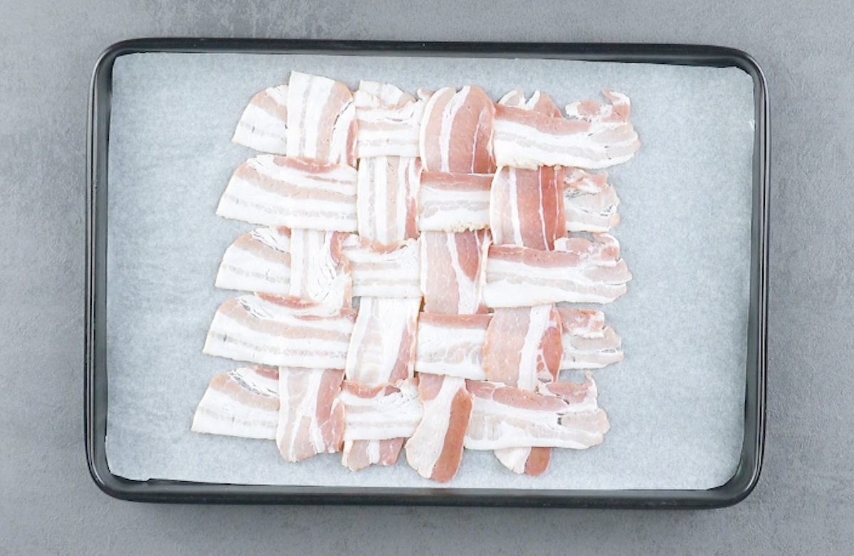 2. Flicht 5 x 4 Scheiben Bacon zu einem Gitter, lege dieses auf ein mit Backpapier ausgelegtes Backblech und stelle es für 30 Minuten in den Kühlschrank.