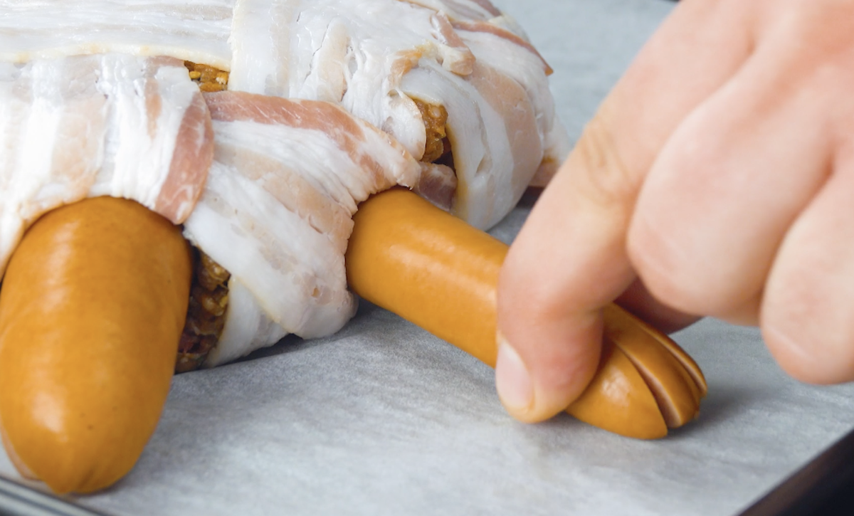 5. Stich rundherum 6 Löcher in den Rand des Baconburgers. Schneide aus der Spitze einer Snack-Wiener ein V-förmiges Stück heraus, sodass es aussieht, als habe das Würstchen einen Mund. Stecke dieses Würstchen dann in den Baconburger.