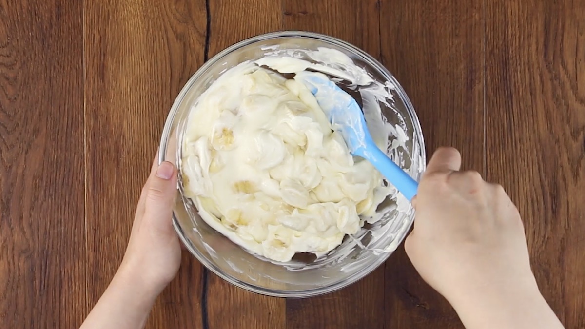 4.) Verstreiche die Creme mit den Bananenstücken auf dem Keksboden. Die nächste Schicht bildet die Schlagsahne.