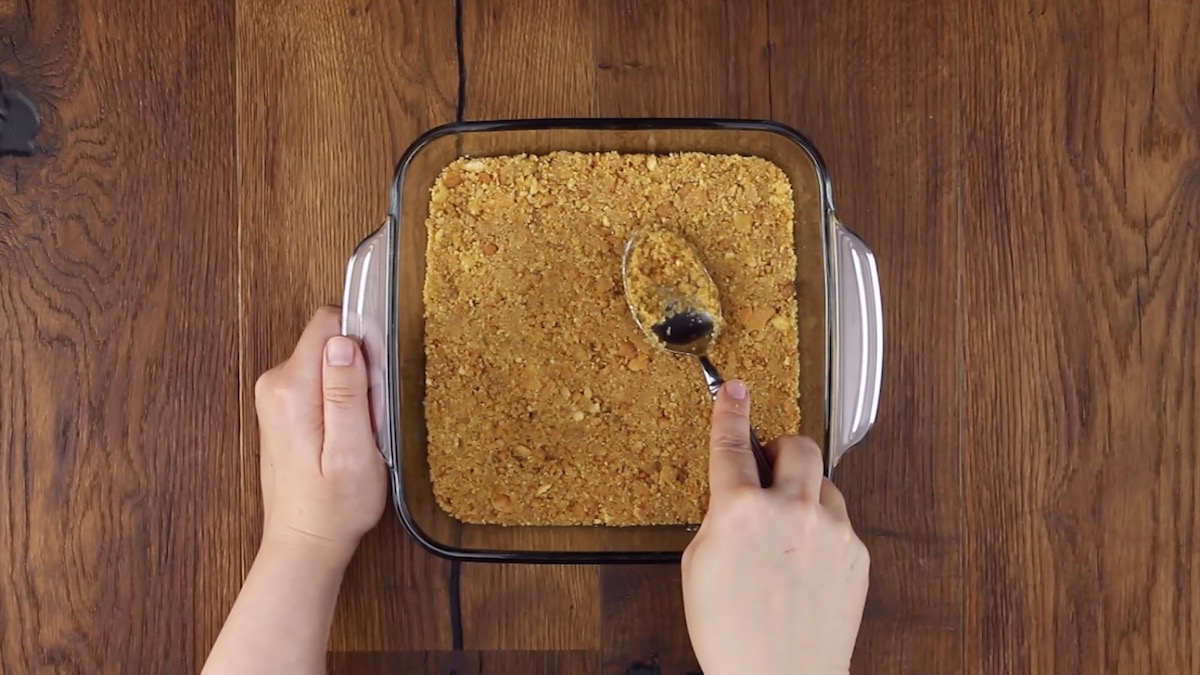 1.) Zerbrösele die Butterkekse und vermenge sie mit der geschmolzenen Butter. Gib die Masse in eine quadratische Auflaufform und drücke sie mit einem Esslöffel fest und flach. Ehe es weitergeht, stellst du die Form kalt.